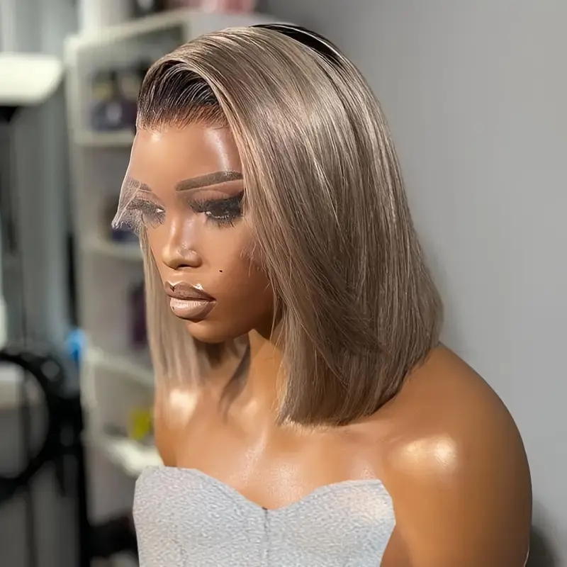 Perruque en cheveux humains brésiliens 12" / 30,48 Cm - #Gris ombré brun (brun clair à brun plus foncé)
